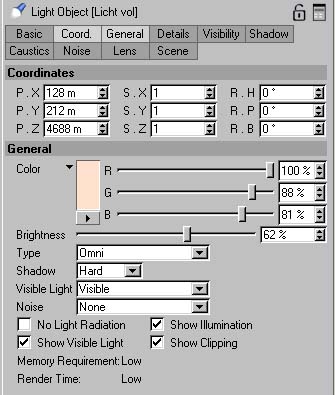 So, wir sollten nun zu unserem ersten Cloud-Material zurückkehren, als ich geschrieben habe RENDER IT! Für das nächste Bild werden wir mit den älteren Einstellungen arbeiten. Die sind hofentlich gespeichert? ;) Wenn nicht, wäre es eine gute Idee das Material neu zu machen. Wenn du fertig bist, erstelle eine neue Lichtquelle und benutze die unten stehenden Werte.