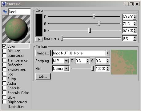 Land. Wähle nun den Farbkanal und dort den Bhodinut 3D Shader.