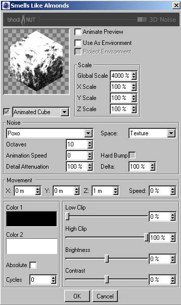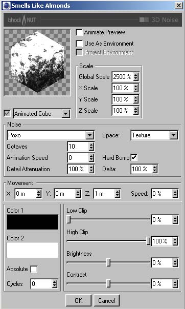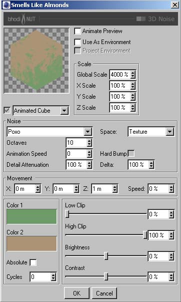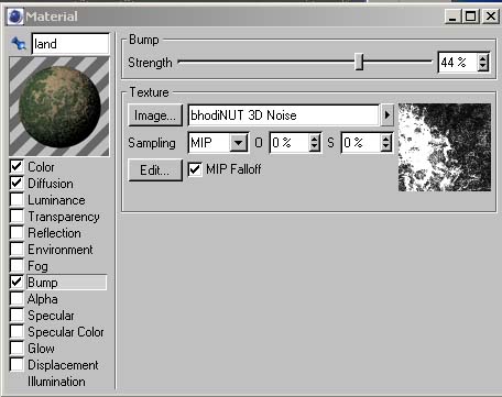 Wenn du fertig bist ziehe das Material per D&D (Drag and Drop) auf das Boden Objekt im OM (Objekt Manager). Wähle eine Flache- oder Würfel-Projektion für das Material. Gefallen dir die Parameter nicht, kannst du sie verändern. Beginne am besten mit dem Diffuse Kanal. Reduziere die 'Global Scale' im Bhodinut Material Dialog oder sieh dir an, was passiert wenn der Diffusions Kanal abgeschaltet wird. Spiel ein bischen mit dem Farbkanal um zu sehen was sich wie verändert. Wenn du mit spielen fertig bist.....