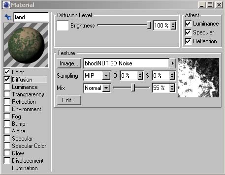 Damit das ganze etwas besser aussehen wird benutzen wir nun den Diffuse Kanal. Für die Werte siehe unten stehendes Bild.