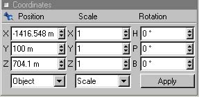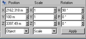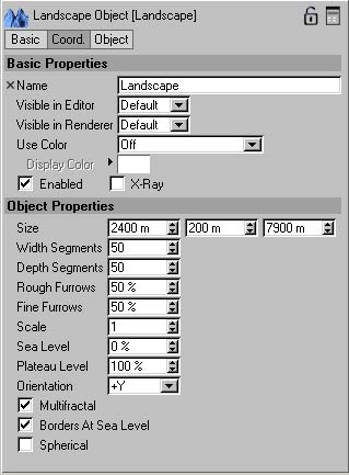 Benutze die Werte der linken Dialogbox für das Landschaftsobjekt. Für die Positionierung des Objektes benutze die Koordinaten auf der rechten Seite. Wenn du möchtest kannst du ein zweites Landschaftsobjekt benutzen. Dazu kopierst du einfach das Objekt und benutzt dann die unten stehenden Koordinaten. Für diese Objekte kannst du natürlich das vorher erstelle Material benutzen.
